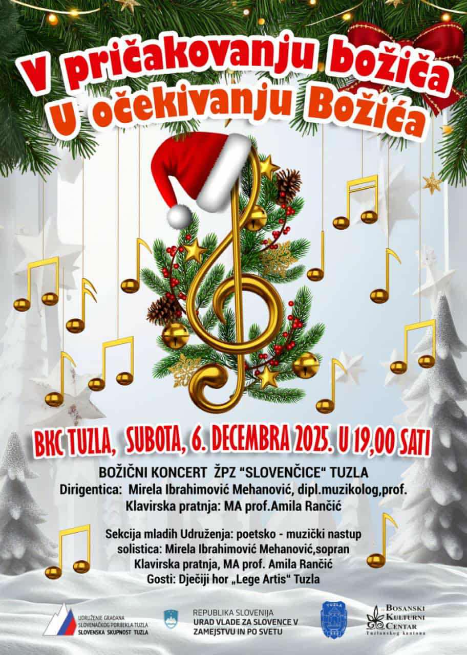 Božićni koncert organizira Udruženje građana Slovenskog kulturnog društva “Slovenčice” Tuzla, uz podršku Vlade Republike Slovenije i partnera. Ulaz je slobodan.