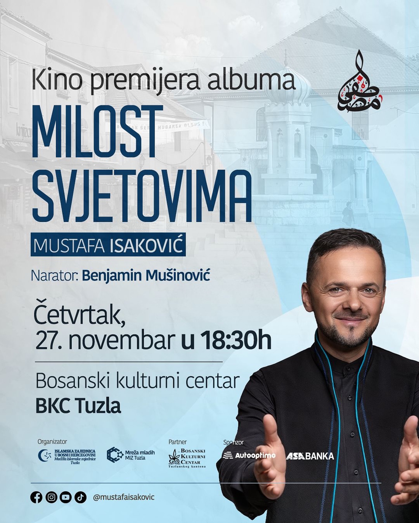 Kinopremijera prvog solističkog albuma ilahija i kasida “Milost Svjetovima” izvođača Mustafe Isakovića bit će održana u Velikoj sali BKC-a u četvrtak 27. novembra 2025. godine sa počekom u 18.30 sati.