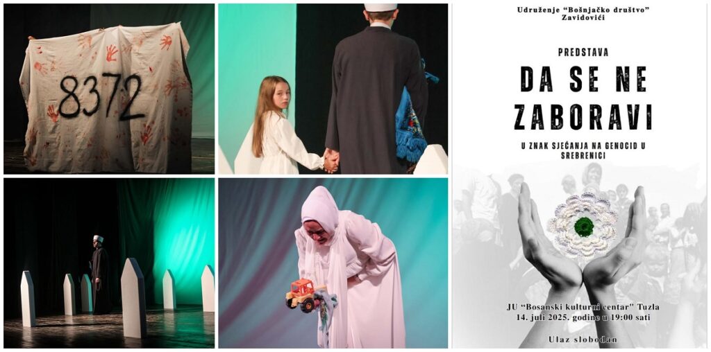 U organizaciji grupe mladih iz Zavidovića, 14. jula u 19:00 sati u Bosanskom kulturnom centru Tuzla bit će izvedena pozorišna predstava pod nazivom “Da se ne zaboravi”, povodom 30. godišnjice genocida u Srebrenici.