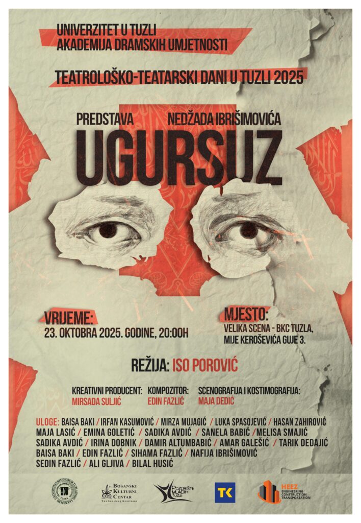 Na Velikoj sceni Bosanskog kulturnog centra Tuzla u četvrtak, 23. oktobra 2025. godine, s početkom u 20:00 sati, bit će održana premijera predstave “Ugursuz” Nedžada Ibrišimovića, u režiji Ise Porovića. Predstava je centralni događaj manifestacije Teatrološko-teatarski dani u Tuzli 2025, koja se održava od 23. do 25. oktobra.