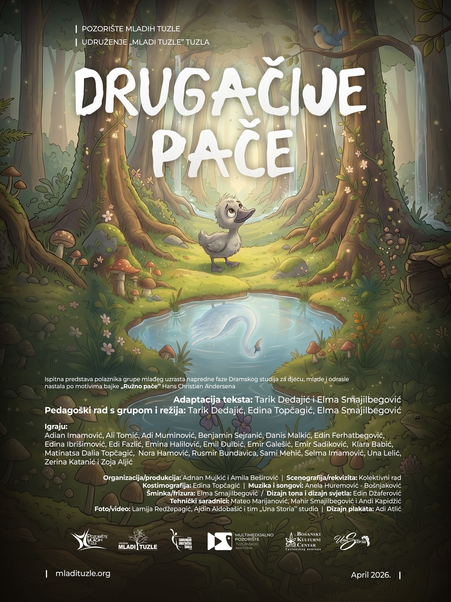 Za četvrtak, 30.4.2026. godine s početkom u 17.00 i 19.00 sati na sceni Bosanskog kulturnog centra TK, Pozorište mladih Tuzle najavljuje svoju 128 premijeru pozorišne predstave. Ovaj put je riječ o predstavi za djecu pod nazivom “Drugačije pače” nastale kao rezultat rada grupe mlađeg uzrasta napredne faza „Dramskog studija za djecu, mlade i odrasle“