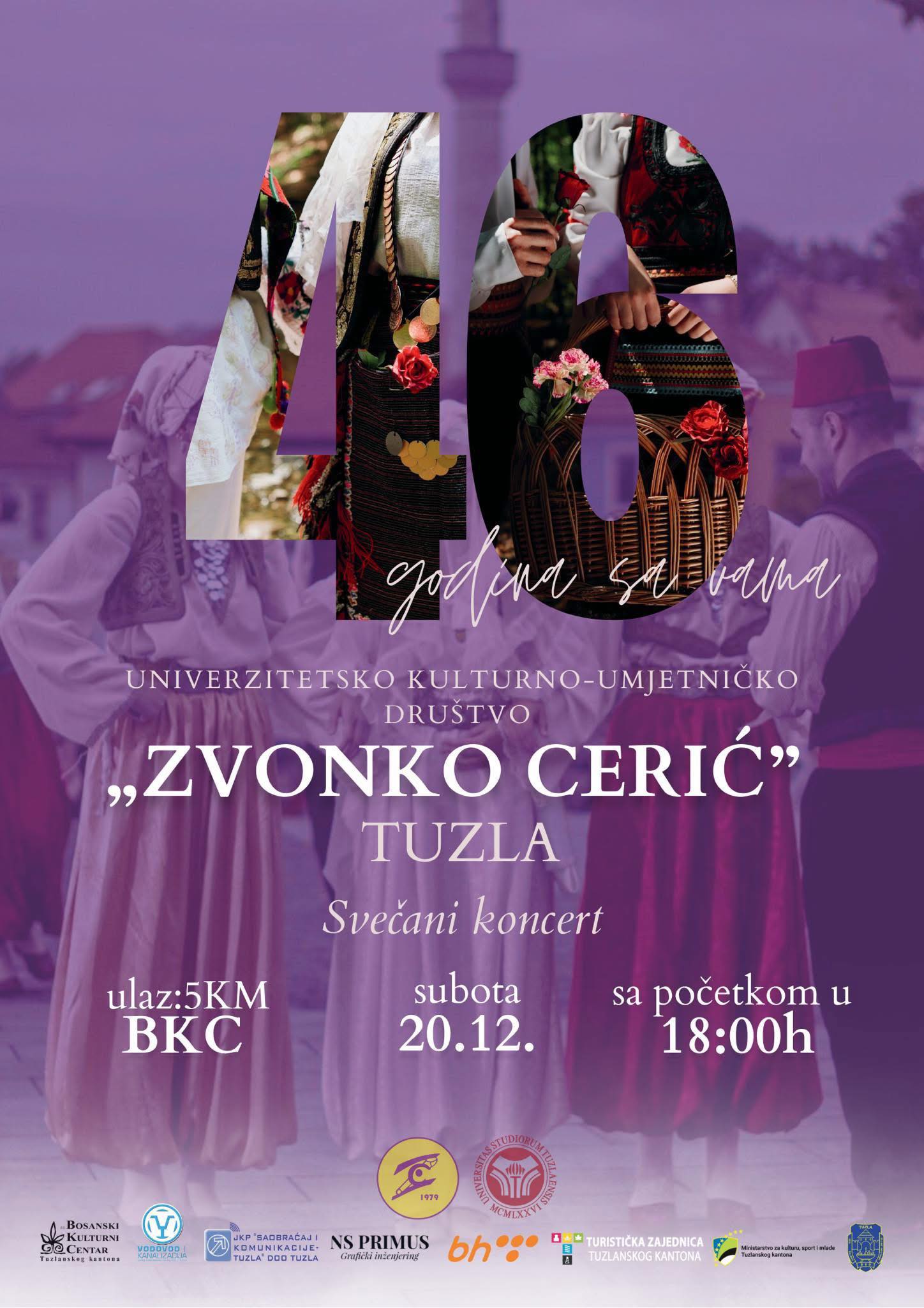 Univerzitetsko kulturno-umjetničko društvo „Zvonko Cerić“ Tuzla obilježava 46 godina postojanja i djelovanja svečanim koncertom koji će biti održan u subotu, 20. decembra, u Bosanskom kulturnom centru Tuzlanskog kantona.