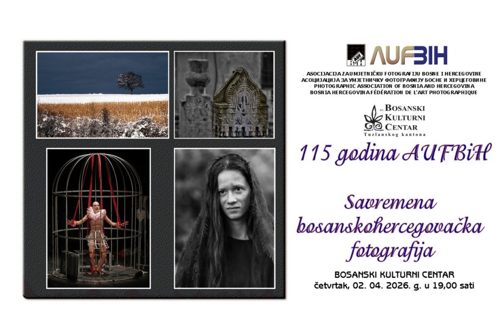 U Bosanskom kulturnom centru Tuzla u četvrtak, 2. aprila 2026. godine, s početkom u 19 sati, bit će upriličeno otvaranje izložbe “Savremena bosanskohercegovačka fotografija”, koja se organizuje povodom obilježavanja 115 godina postojanja Asocijacije za umjetničku fotografiju u Bosni i Hercegovini (AUFBiH).