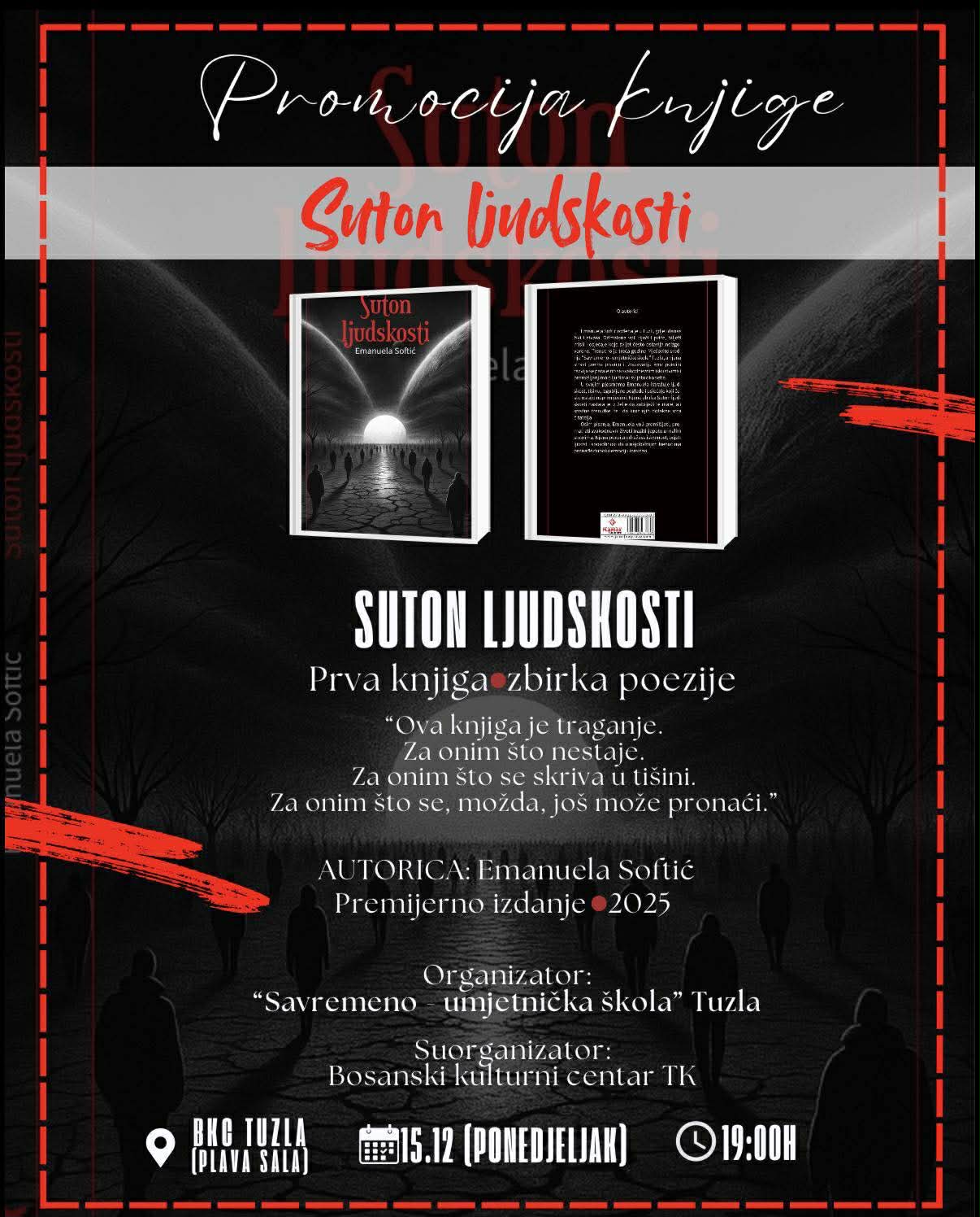 U okviru obilježavanja Dana “Savremene umjetničke škole” Tuzla, u ponedjeljak 15. decembra u Plavoj sali Bosanskog kulturnog centra TK biće održana promocija prve knjige mlade autorice, Emanuele Softić pod nazivom “Suton ljudskosti”. Riječ je o zbirci savremene poezije, koja je nedavno izašla iz štampe, a koja već svojim naslovom nagovještava snažne, emotivne i hrabre stihove mlade autorice.
